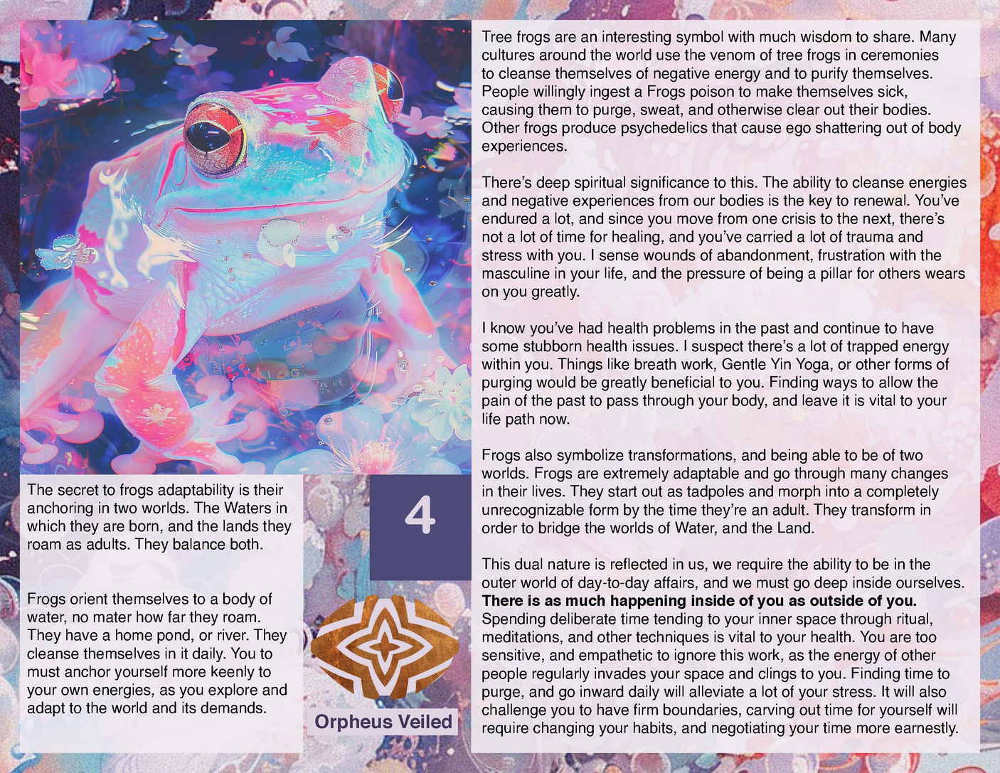 image and insight here reflects a profound dialogue between a person and their soul. Dream Walking starts with a one-hour live conversation that includes dialogue, active imagination, and guided meditations to bring your dreams to. The real work continues afterward, as I meditate on your dream's symbols, receive visions, and listen to your higher self. What results is a symbolic map—a mirror of your psyche, crafted with art, words, and ritual. All work shown is published with client; they can choose to share or keep their portfolios private. If you'd like your portfolio displayed, please contact me.